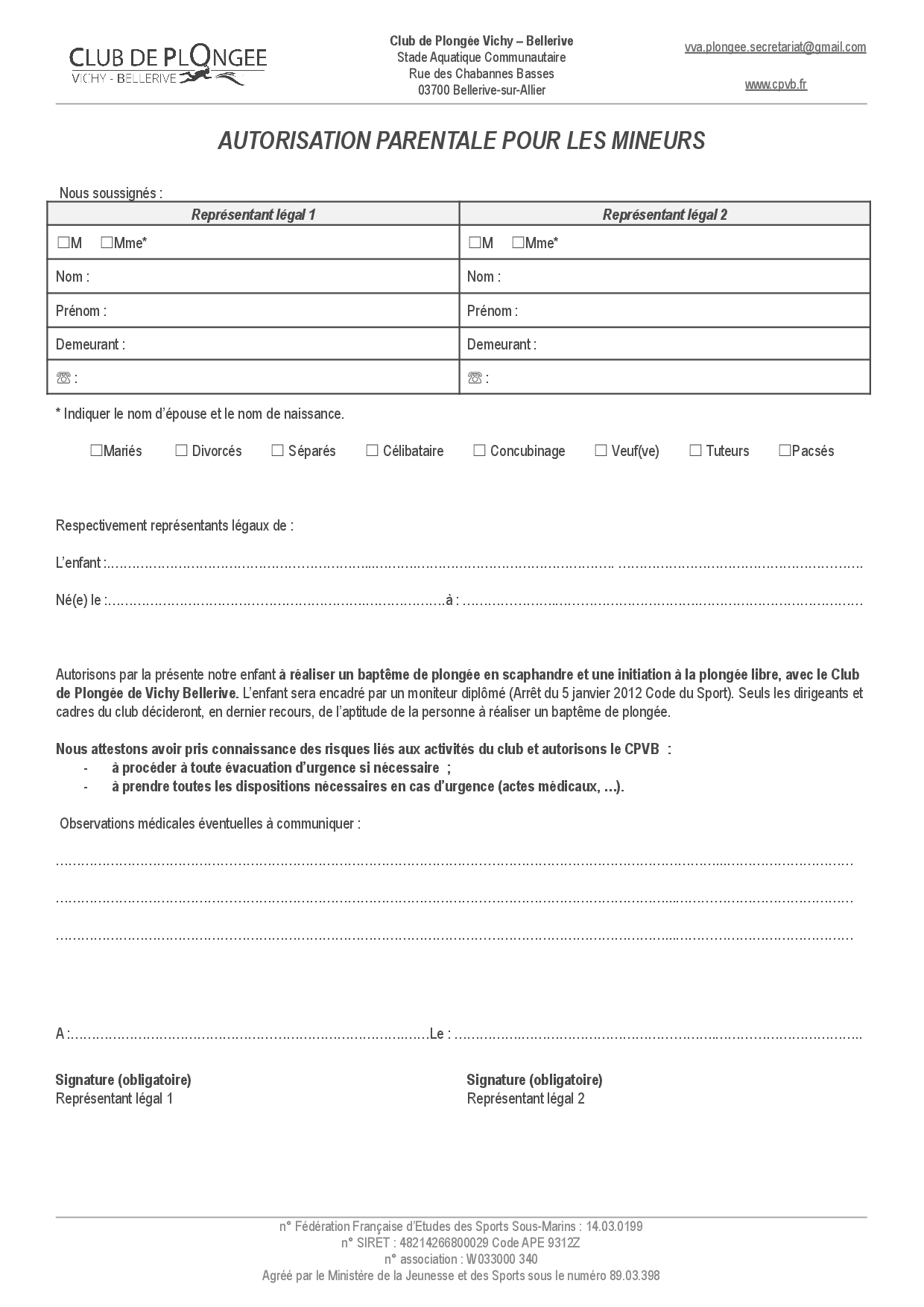 Pour les mineurs (<18 ans) l'autorisation parentale suivantes devra ĂȘtre complĂ©tĂ©e obligatoirement pour le jour du baptĂȘme) : https://drive.google.com/file/d/1XC6OKdwsTHCjtKFvDc6uDZN974EuUsWh/view?usp=sharing
